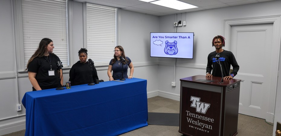 On Thursday, October 2, Tennessee Wesleyan University hosted its annual Open House, welcoming prospective students to campus and offering tours and information sessions. To their surprise, our communication studies department and students organized a podcast segment that included a Jeopardy-style game called “Are You Smarter Than a Bulldog?” This event brought together current Bulldogs and prospective students for a fun, interactive experience.