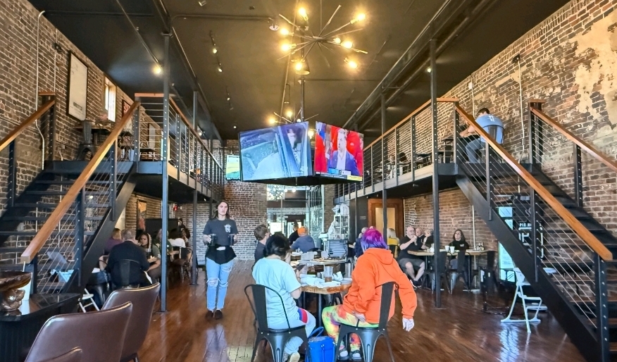The exterior of Pie Hound seems unassuming; however, the interior is filled with life. The entrance doors are large, wooden and glass double doors that lead into the open concept restaurant. The brick interior gives a rustic look that is coupled with the industrial framework, creating an interesting aesthetic, especially for the small town of Athens, Tennessee.
