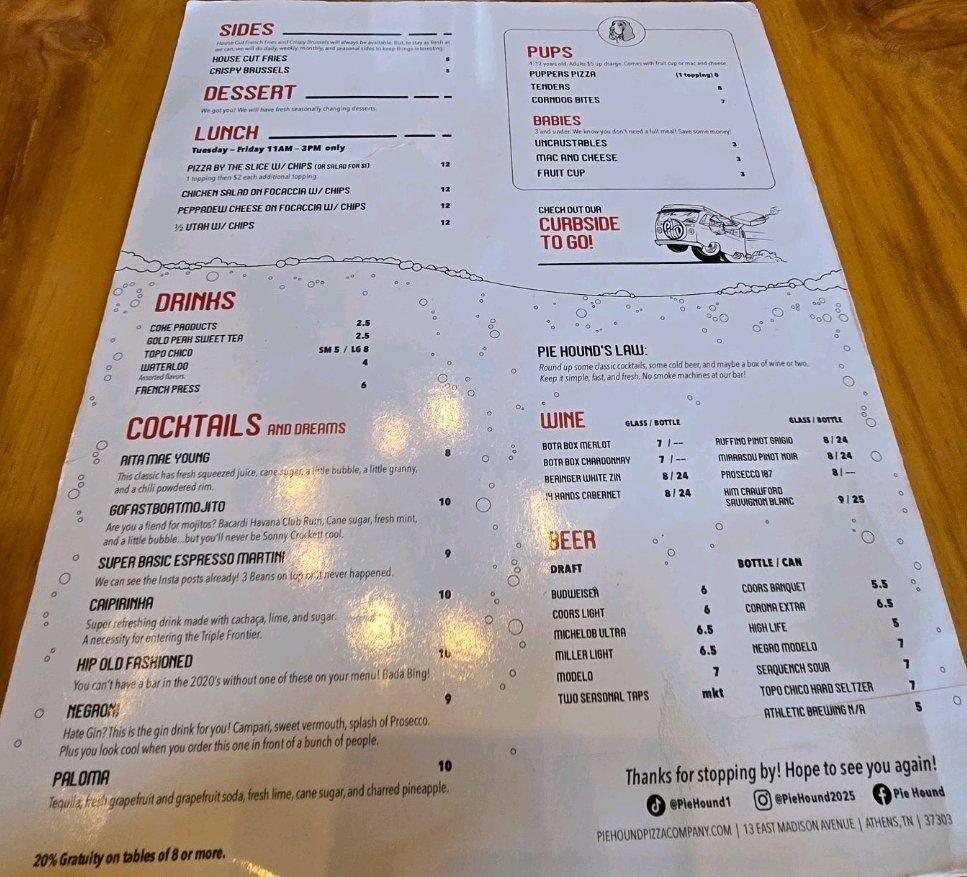 Pie Hound, a new pizza restaurant, is located at 13 East Madison Avenue, Athens, Tennessee. It is in the heart of downtown, and very close to Tennessee Wesleyan University’s campus, making it a spot to hang out or get some food for college students.